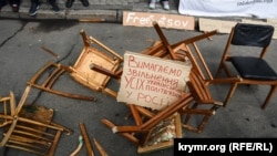 В Киеве у здания администрации президента Украины прошла акция “Хватит сидеть” в поддержку Олега Сенцова, объявившего бессрочную голодовку в российской тюрьме. Стульев наломали много.