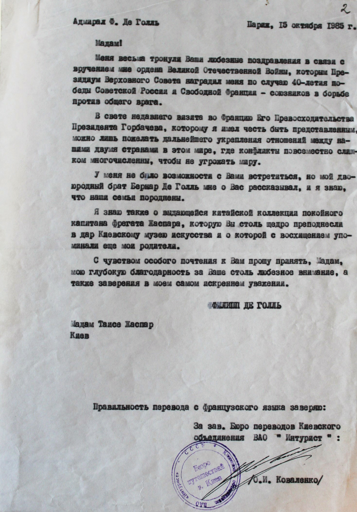 Председатель КГБ писал: Таисия не только знает быт, обычаи и привычки Де Голля и его семьи, но и в последние месяцы переписывалась с ним. Сначала Жаспар отправила президенту Франции свою недавно вышедшую книжку и объяснила, что это подарок для его внуков. В следующих письмах она напомнила о покойном муже, рассказала историю китайской коллекции (к письму прилагался каталог) и предложила осмотреть ее во время предстоящего визита в Киев.